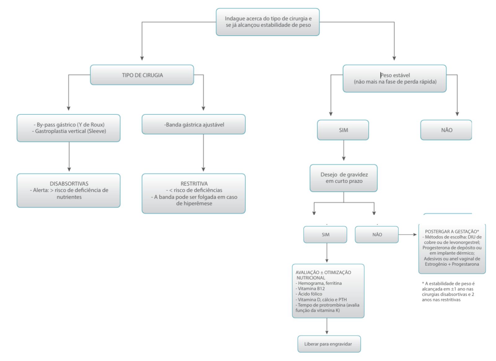 Apesar da melhora da fertilidade, o aconselhamento pré-concepcional e o pré-natal dessas pacientes merecem maior atenção. Diversos aspectos relacionados à gestação e ao acompanhamento reprodutivo de pacientes submetidos à cirurgia bariátrica podem ser organizados em etapas para facilitar o entendimento e o manejo clínico. Nesse cenário, a FEBRASGO lançou em 2023 dois fluxogramas acerca dessas intervenções, um deles relacionado à consulta pré-concepcional e o outro, relacionado ao acompanhamento gestacional. (Federação Brasileira das Associações de Ginecologia e Obstetrícia - FEBRASGO, 2023)